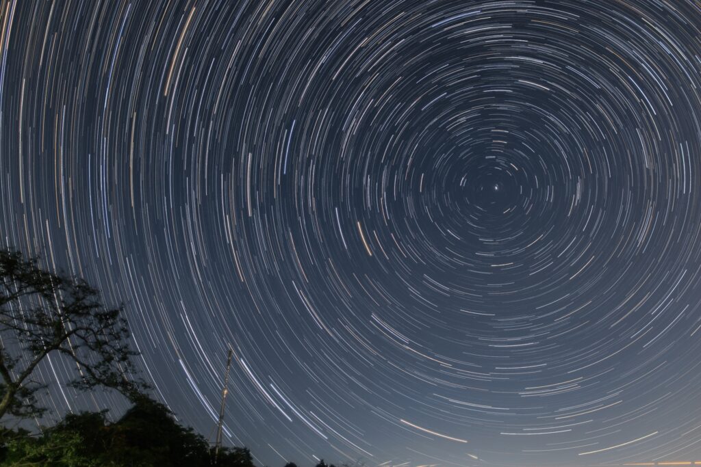 同じ場所で1時間インターバル撮影して繋げました。北極星を中心に反時計周りに星の軌跡が撮れました。今回はこれを撮りたかったんです!無事任務完了。