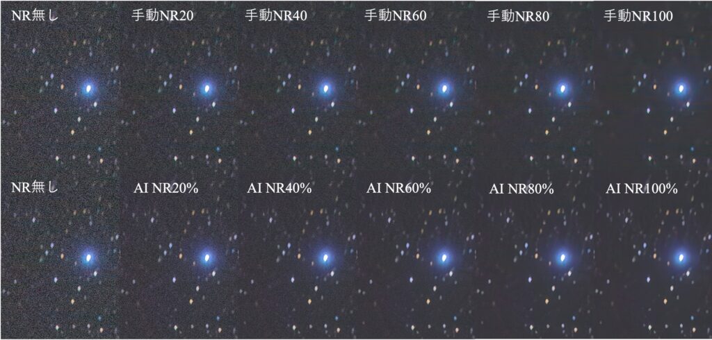 ノイズ除去無しは前景のざらつきが目立ちますが、手動ノイズ軽減とAIノイズ除去の差はこのサイズではあまり目立たないように思えます。