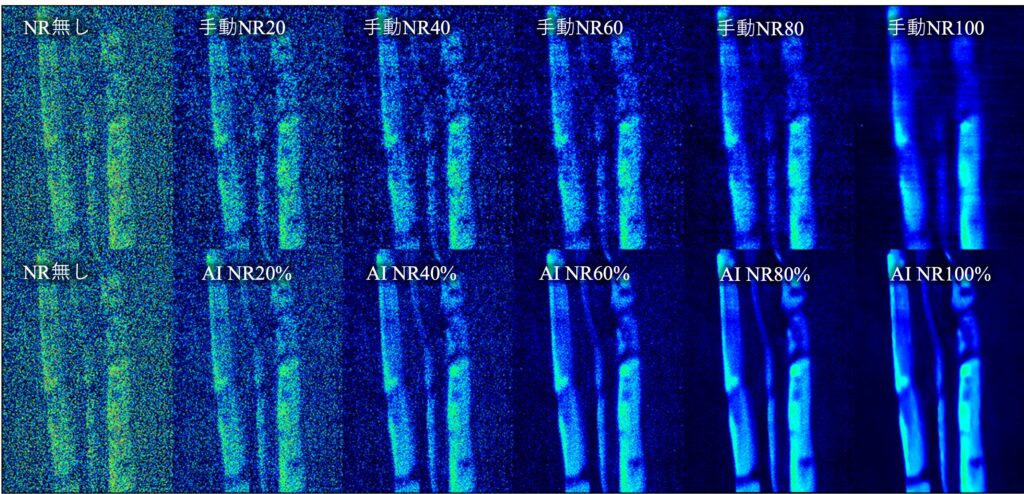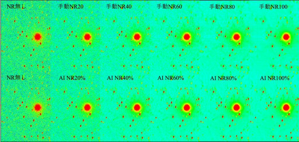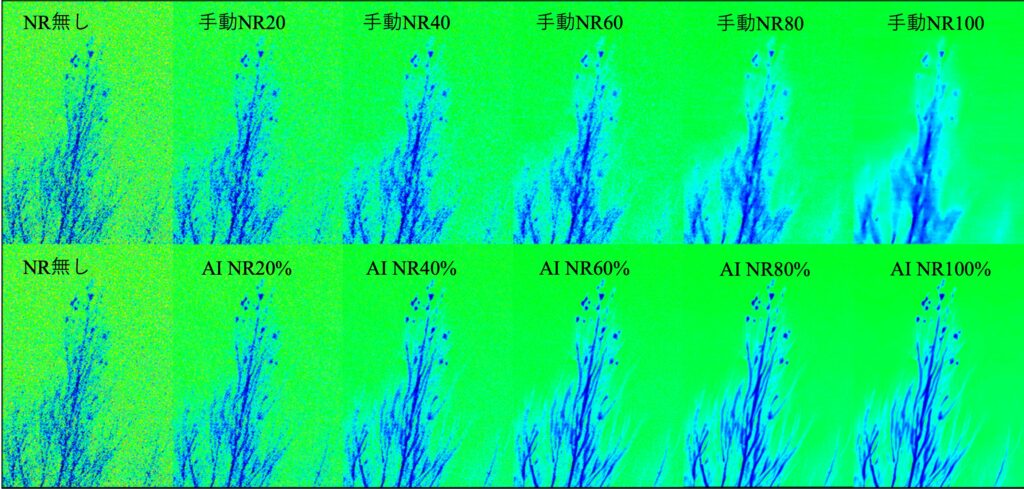 手動ノイズ軽減は40以下では背景のばらつきが目立ちます。AIノイズ除去は40%で背景のざらつきが低減されました。