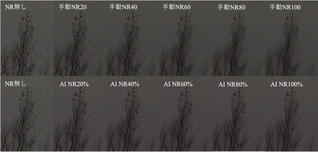 手動ノイズ軽減は60以下では背景のばらつきが目立ち、枝の部分は60以上では破綻してしまっています。一方、AIノイズ除去は40%で背景のざらつきが低減し、枝の部分は100%でもディテールが残っています。