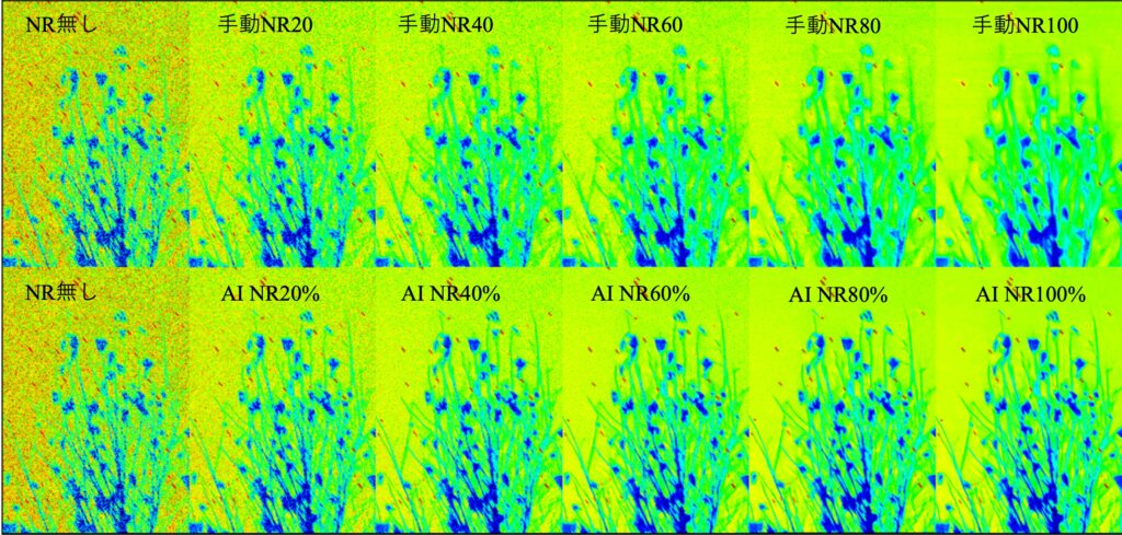 各部詳細の輝度マッピング比較です。R, G, Bを1:1:1で平均を取り0〜128でカラーコンター表示させています。元画像より輝度のわずかな違いを目立たせるためにこのような表示にしています。この表示画像からもAIノイズ除去はざらつきが早い段階で低減されていることがわかります。