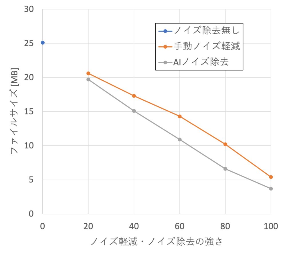 両方ともノイズ除去の強さを大きくすると、ファイルサイズは直線的に小さくなります。これはイメージがつきやすい結果だと思います。