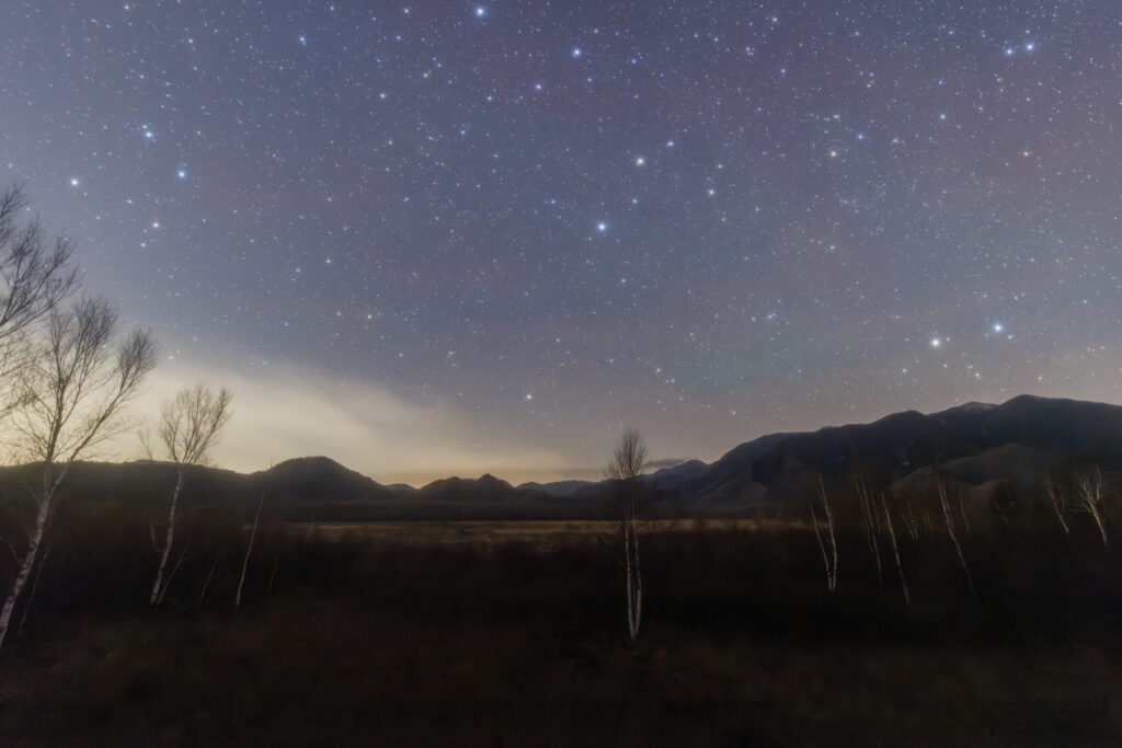 戦場ヶ原展望台より西の空。中央にはしし座レグルス。下にはうみへび座の一部やふたご座ポルックス。撮影の時にカメラを少し上向きにしましたがLightroomで歪み補正を入れてみました。そのため右上と左上の星が少し伸びます。あまり目立ちませんかね。